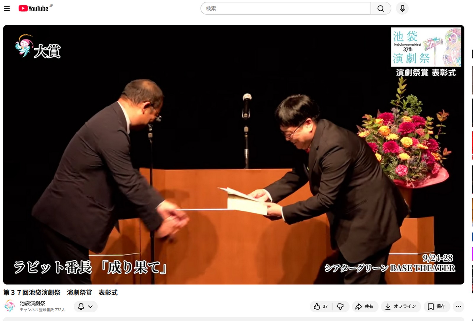 第37回池袋演劇祭 《大賞》ラビット番長 《優秀賞》THEATRE MOMENTS 《優秀賞》チーム・クレセント |