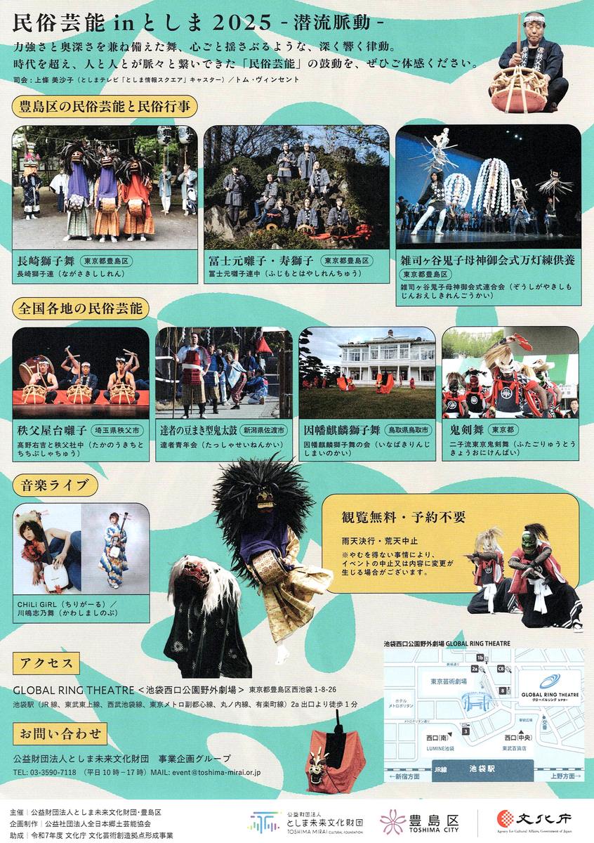 ![]() 「長崎獅子舞」椎名町駅前の旧長崎村の鎮守である現在の長崎神社に<悪疫災厄退散、五穀豊穣、雨乞い、厄除け、天下泰平を祈る獅子舞。 「冨士元囃子連中」 明治30年頃に現豊島区高松の長崎富士塚(国指定文化財)の講元であった一家から発祥 「雑司が谷鬼子母神 御会式連合会」 団扇太鼓の独特なリズムを響かせ、枝垂れ桜様の万灯が練り歩く。 区外からは、秩父市の「高野右吉と秩父社中」。新潟県佐渡市の「達者青年会」<達者の豆まき型鬼太鼓>。鳥取市の「因幡麒麟獅子舞の会」。都内からは「二子流東京鬼剣舞」で計4団体が参加する。 ■民俗芸能inとしま https://toshima-pjt.jp/minzoku-geinoh2025/ ■豊島区無形民俗文化財 https://www.city.toshima.lg.jp/349/bunka/bunka/bunkazai/minzoku.html |