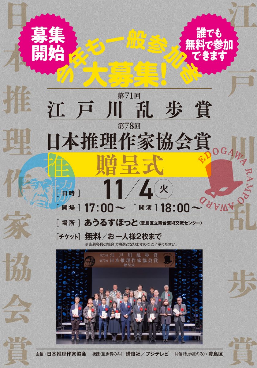 江戸川乱歩賞 日本推理作家協会賞 11月4日 贈呈式 [あうるすぽっと]で YouTubeで中継 |