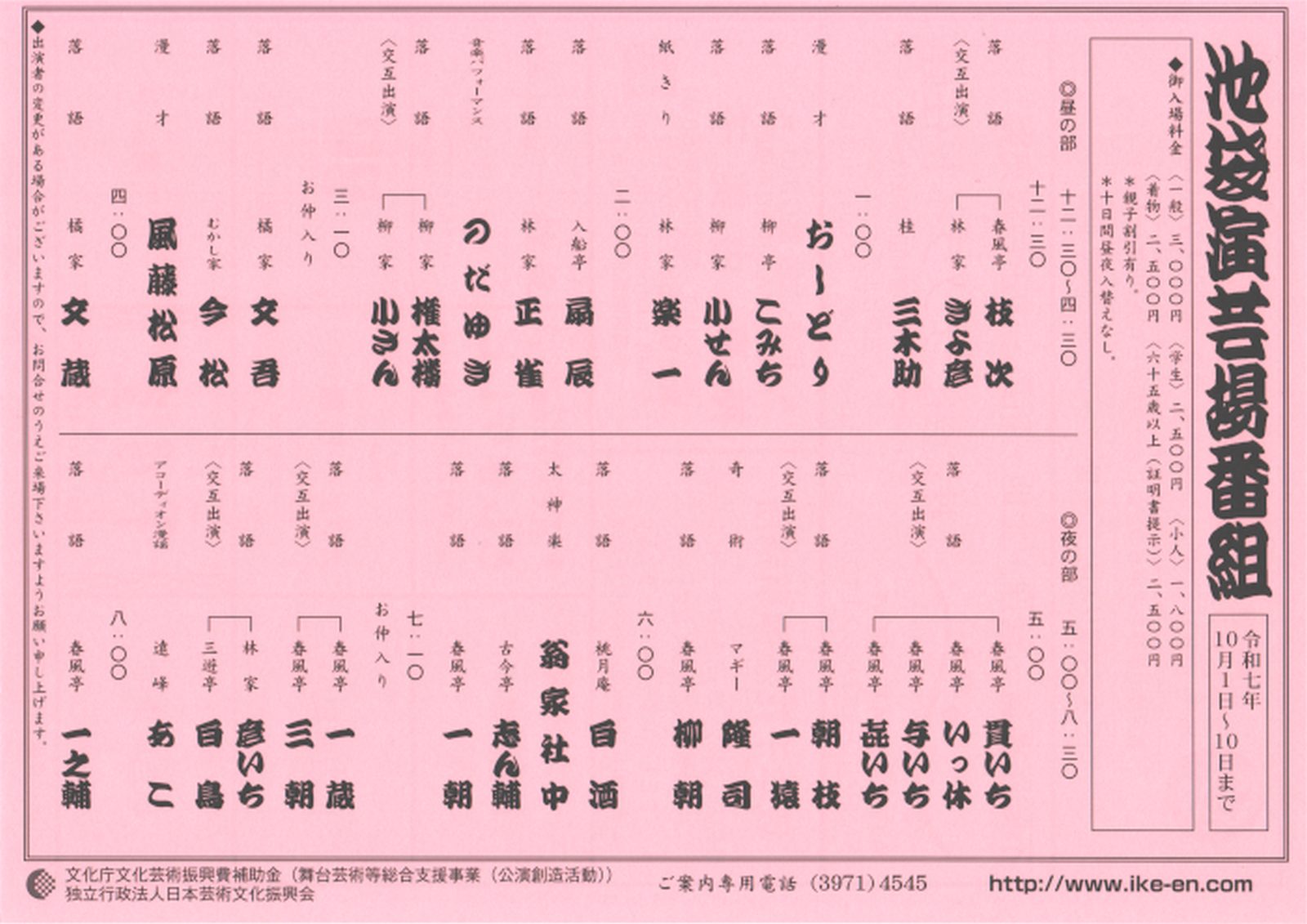 春風亭一之輔・春風亭一朝・古今亭志ん輔 橘家文蔵・柳亭こみち・入船亭扇辰 池袋演芸場10月上席 |