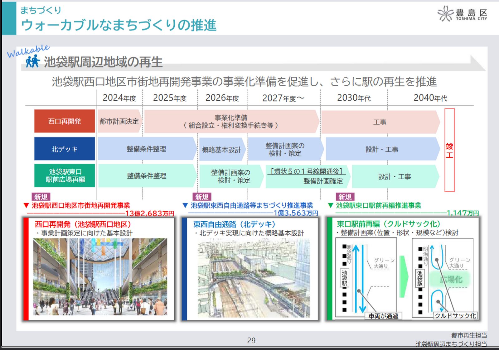 池袋駅西口再開発のスケジュール 解体・新築工事は2027から2030年代に 竣工は2040年代 東西を結ぶ北デッキ概略基本設計を2026年開始 |