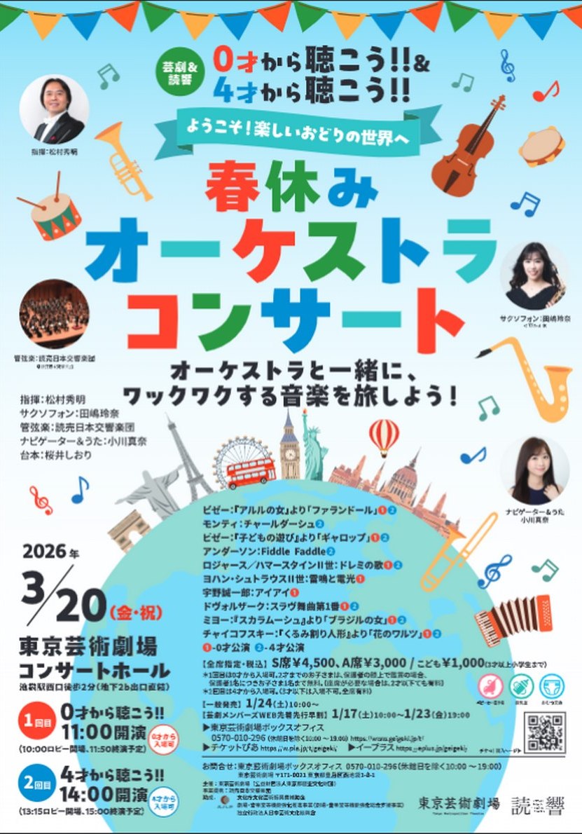 池袋西口公園のグローバルリングで、3月4日(PM6~PM7)にブラスバンドのコンサートがある。演奏曲は、アイヴズ:アメリカ変奏曲、ガーシュウィン:ラプソディ・イン・ブルーなど。 演奏者は国内のオーケストラの管楽器の名手たちのブラスバンド。<ジャパン・スペシャル・ブラス・プレイヤーズ2026>メンバーは、Tp(川田修一さん、尹干浩さん、服部孝也さん)、Hr(濱地宗さん)、Tb(伊藤雄太さん、髙瀨新太郎さん、辻姫子さん、野々下興一さん)、Tub(佐藤和彦さん)、Perc(森田和敬さん)。 そして、ドイツなど世界各地のオーケストラと共演しているイエルーン・ベルワルツさんと児玉隼人さんがゲスト出演する。児玉さんは2009年生まれの若手ですでにN響、読響、東響などとソリストとして共演している名手。 入場無料、椅子席280、立見可能 事前申込不要 ■Tokyo Music Evening Yube https://www.city.toshima.lg.jp/130/bunka/kanko/kikaku/1912230850.html ■イエルーン・ベルワルツ https://music-partners.jp/artists/jeroenberwaerts/ ■児玉隼人サイト https://hayatokodama.com/hayatokodamacom |