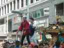 | 池袋西口駅の周辺は12時過ぎごろからそれぞれの町会から御輿が集まり、午後1時から御嶽神社の例大祭として、子供御輿を先頭に御輿(第三地区14町会の御輿30基余)のパレードがはじまった。パレードは駅前のロータリーをゆっくり一回りしてときわ通りにでて御嶽神社に向かった。しばらくあとに例大祭とは別に千早小学校の子供たちがPTAの手作りの御輿で駅前からパレードを始めた。本日は、このあと駅前ステージで獅子舞や歌謡ショウなどが行われ、午後5時30分からは大御輿16基が参加する「宵御輿」パレードの発進式が行われる。この大御輿の中には外国人の人たちがかつぐ「国際交流おみこしをかつぐ会」も参加する。 写真集 ここをクリック⇒ |