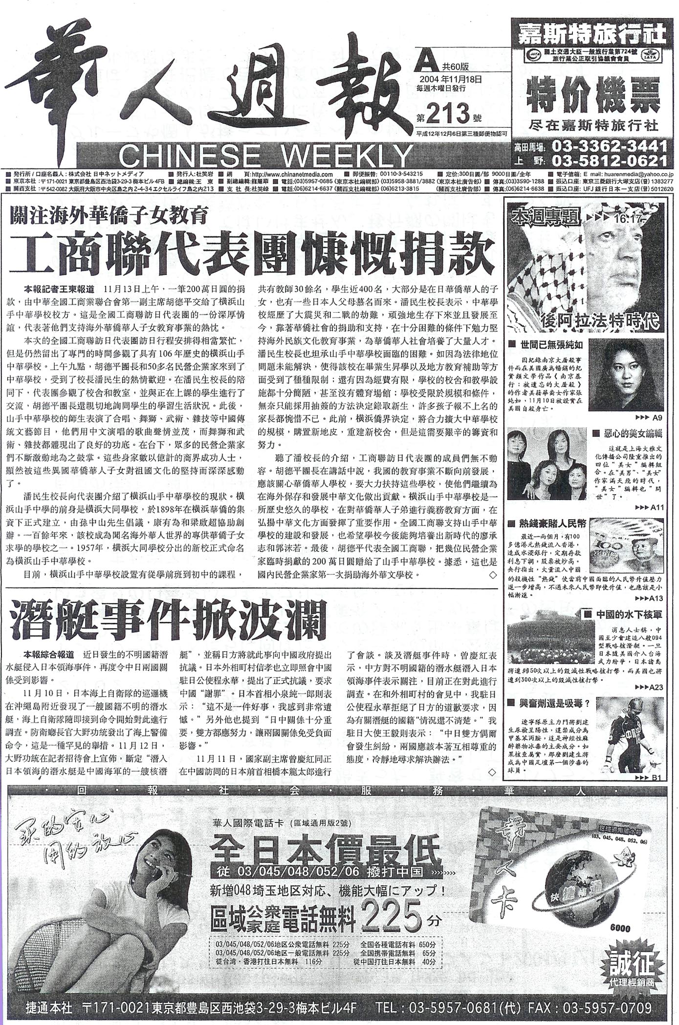 ●知音報(1日・15日発行)タブロイド 11月15日号52ページ 発行 知音社 西池袋1丁目 http://www.zhiyinjp.com ●華人週報(毎週木曜)タブロイド 11月18日号36ページ 発行 株式会社日中ネットメディア 西池袋3丁目 http://www.chinanetmedia.com ●東方時報(毎週木曜) 新聞サイズ 11月18日号32ページ 発行 株式会社東方インターナショナル 豊島区南大塚1丁目 http://www.toho-jp.com ●日本新華僑報(月3回 8日18日28日)新聞サイズ11月8日号24ページ 発行 株式会社日本新華僑通信社 豊島区南大塚3丁目 http://www.jnocnews.com ●陽光導報 タブロイド(毎週木曜)11月11日号 52ページ 発行 株式会社陽光 川崎市川崎区日進町 http://youkou.co.jp |