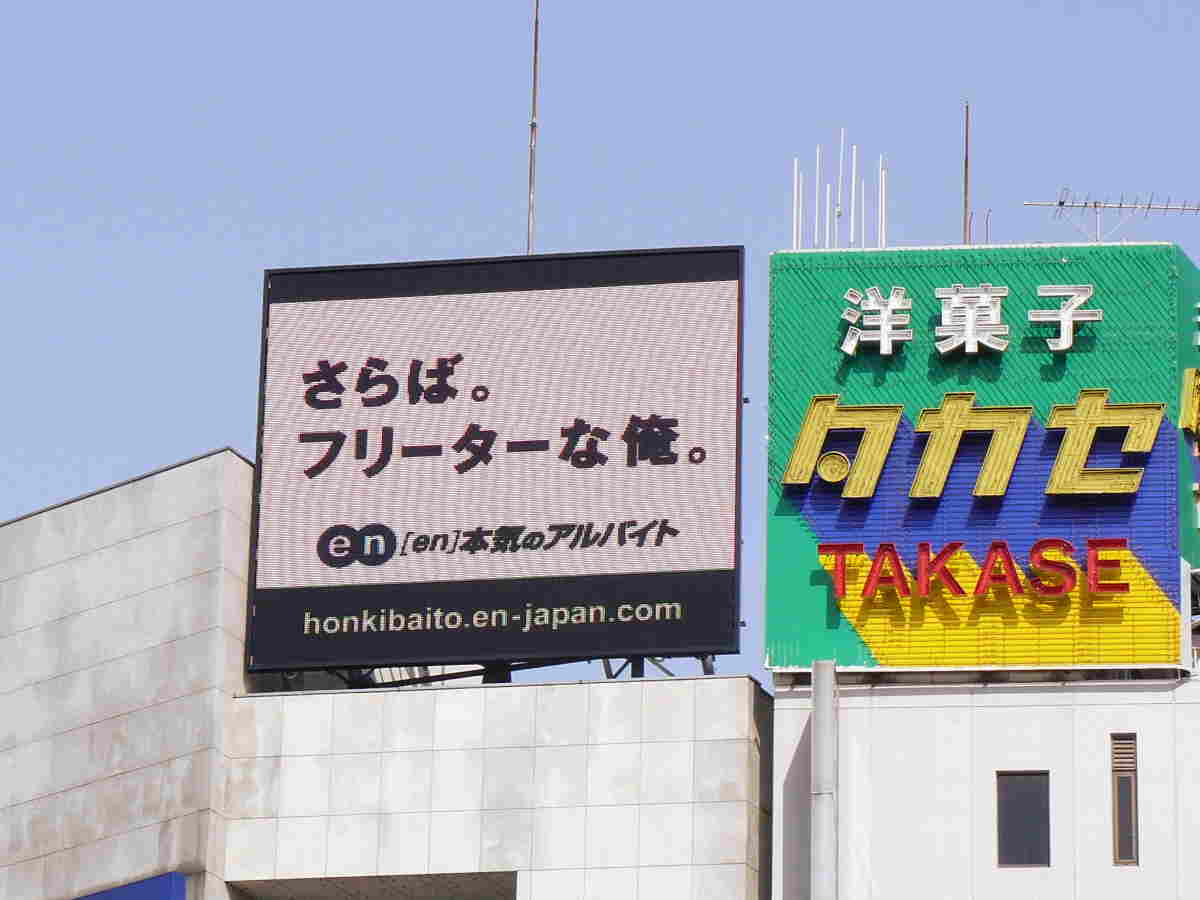 すでに東口には、サンシャイン60階通りには、シネマサンシャイン、池袋ギーゴにもディスプレイがある。さらにサンシャイン60階通りの入り口のフジキの屋上にもなにやら大きなディスプレイらしきものが設置されつつある。広告もネオンや静的な広告から動画の広告の時代になってきた。 ■エン・ジャパン http://www.enjapan.com/ |