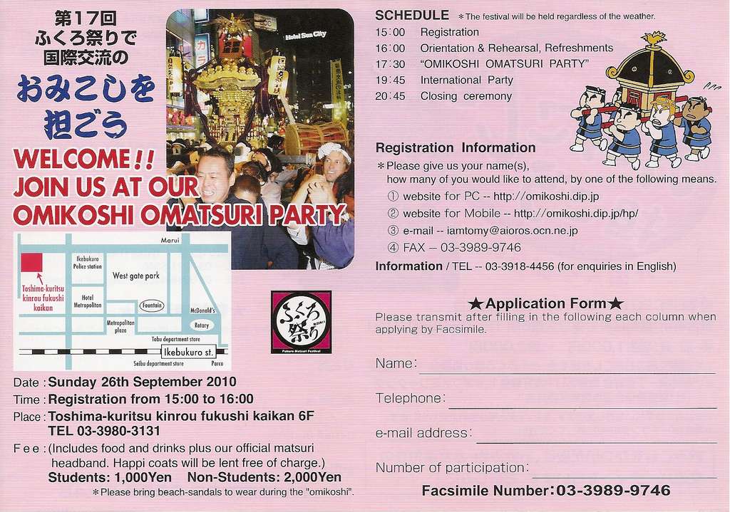 9月26日のお神輿パレードには「国際交流おみこし」も参加する。その「国際交流おみこし」を担ぐ外国人参加者の募集が行われている。3時に集合して5時半ごろからみこしを担ぐ日程、参加費は学生1,000円、一般2,000円。詳しくは下記HPで。 ■ふくろ祭り http://www.yosakoitokyo.gr.jp/ ■国際交流みこし http://omikoshi.dip.jp/ |