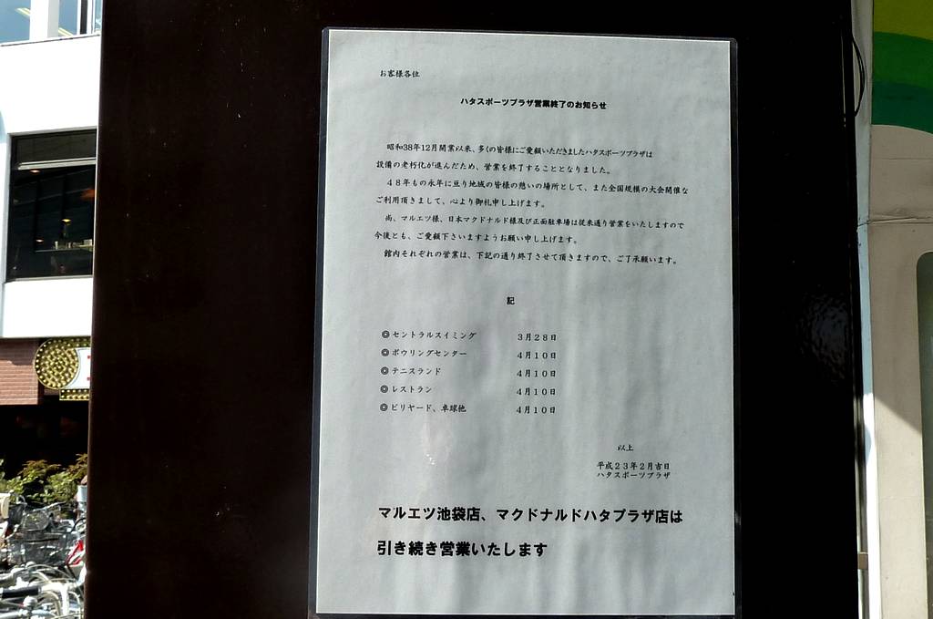 ハタスポーツプラザは、東京オリンピックの前年の昭和38年12月に開場していらい48年のあいだには、各種の全国規模のボーリング大会などの会場として親しまれてきた。現在はボーリング場やセントラルスイミングや室内テニスコート、ビリーヤードなどで利用されていたのだが、施設の老朽化が進んだので営業をやめるという。 ■ハタスポーツプラザ http://www.hata-sports-plaza.net/ |