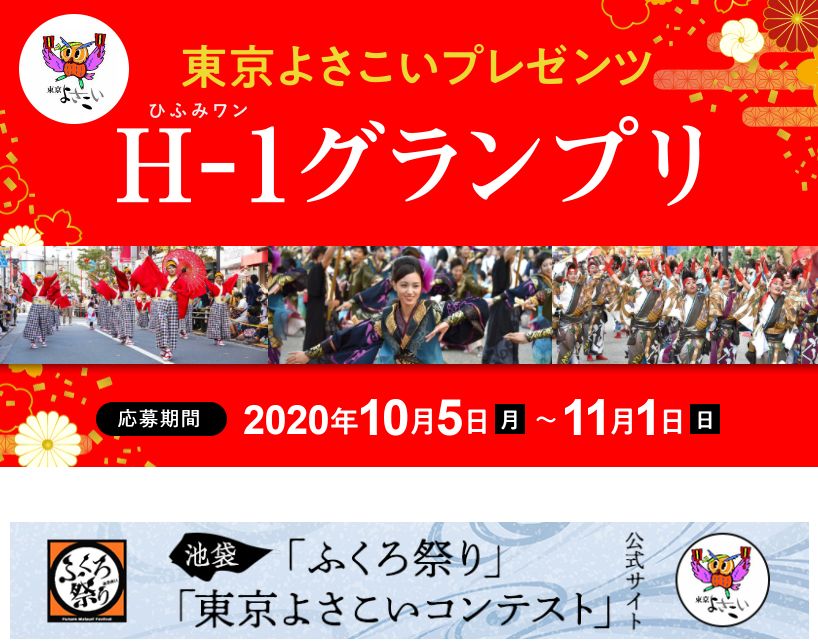 新型コロナ感染拡大防止にため中止となった「東京よさこい」が全国のよさこいの踊り手の参加できる「オンライン」でコンテスト「H-1(ひふみワン)グランプリ」を開催する。募集期間は10月5日から11月1日。池袋西口の秋の一大イベント『ふくろ祭り』の後半日程の「東京よさこい」は10月10・11日に開催予定だったが、昨年の第20回も台風の直撃で中止となっていて2年連続で中止となった。 その代わりに「東京よさこい」は全国のよさこいの踊り手がオンラインで参加できるオンラインイベント「H-1(ひふみワン)グランプリ」を開催する。 応募するには「ひふみ」の演舞の様子を事務局に送信する。演舞する「ひふみ」は<ふくろ祭り50周年を記念>して作曲された「東京よさこい」のオリジナルな曲。審査して大賞、準大賞等を選出し、特設ホームページ上で表彰するイベント。グランプリには賞金5万円と次回のよさこい参加費無料、準グランプリ、演出賞,SNS特別賞、演舞賞などが設定されている。 なお演舞のサンプル動画や応募方法が下記のHPに掲載されている。 ■ふくろ祭り https://h-1grandprix.tokyo/ |