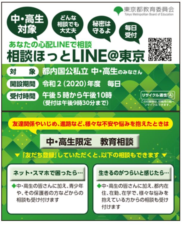 東京都教育員会が都内の約64万人の中学生、高校生(国公私立在学)を対象に無料通話・メールアプリ(LINE)で教育相談の窓口を開設している。対象となる中高生には「相談ほっとLINE@東京」カードを配布して知らせている。相談時間は午後5時から午後10時まで(受け付けは9時30分まで)都教育相談センターが運営し「SNS教育相談支援員」が相談に応じている。その相談窓口の4月から9月の利用状況が10月22日に公表された。登録数は9月30日の時点で26,561人で相談件数は1,800件(1日平均9.8件)となっている。 相談内容は、友人関係434件、学業不振187件、家族関係174件、進路105件、そして6番目が男女関係59件、教員等との関係58件、虐待37件、いじめ30件などとなっている。 相談者の属性は、76.4%が女子、男子は15.4%、学校別では中学生が53.8%、高校・高専37.2%。 東京都教育相談センターには「いじめ相談ホットライン」、「高校進級・進路・入学相談」、「通訳を介した外国人児童・生徒の高校等進路・教育相談」などの窓口がある。 ■東京都教育相談センター https://e-sodan.metro.tokyo.lg.jp/ ■SNS教育相談 https://www.metro.tokyo.lg.jp/tosei/hodohappyo/press/2020/10/22/03.html |