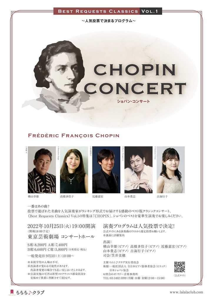 10月25日19時からの東京芸術劇場で「ショパン コンサート」がある。演奏は横山幸雄さん、高橋多佳子さん、近藤嘉宏さん。山本貴志さん、古海行子さんの5人の名手。司会は笠井美穂さん。演奏する曲は、ショパンの「演奏曲人気投票」メニューの55曲<即興曲 第1番 変イ長調 Op.29から、ピアノ協奏曲 第2番 Op.21より第2楽章 変イ長調(ピアノ独奏版)まで>の中から演奏を希望する曲を選び、10月9日までにインターネットで投票で、その人気上位曲をランキング形式で演奏される。投票は1曲から10曲まで投票できる。 投票は、10月9日までに下記の公式サイトから、演奏曲する曲も10月15日に公式サイトで発表される。 ■ショパン・コンサート https://lalalaclub.com/brc/ |