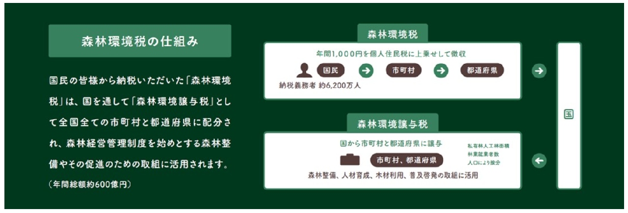 今年から 1,000円の森林環境税 森林を守り生かす 住民税と同時に課税される 年間総額約600億円 |