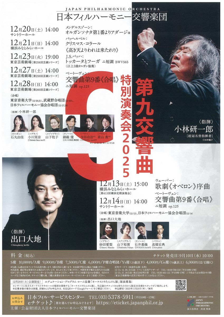 まもなく師走、ベートーヴェンの第9交響曲(合唱)の演奏会が各地で開催される。池袋の東京芸術劇場では、12月7日から12月28日まで[9回]の第9演奏会がある。最初は12月7日の<日本フィルハーモニー>で「東京フロイデ合唱団」の演奏会で、指揮者は小松長生さん、そして<日フィル>主催で12月23・27・28日は小林研一郎さんが指揮する。合唱は武蔵野合唱団(23日)と日本フィルハーモニー協会合唱団(27.28日)で日フィルは芸劇で計4回の演奏する。 <読売日本交響楽団>は12月20・21・26日にマキシム・パスカルさんが指揮する。合唱は新国立劇場合唱団。 <パシフィックフィルハーモニア東京>は、12月18日に飯森範親さんの指揮で、合唱は武蔵野音楽大学合唱団ほか。 <東京都交響楽団>はクリスマスイブの12月24日にサッシャ・ゲッツェルさんの指揮で、合唱は新国立歌劇場合唱団。 楽団別の年末の第9演奏の回数は、日フィルは10回、読響は7回、都響は2回、パシフィックフィルは1回。 ■東京芸術劇場 https://www.geigeki.jp/calendar/?cy=2025&cm=12 ■日本フィルハーモニーhttps://japanphil.or.jp/ ■読売日本交響楽団 https://yomikyo.or.jp/2025dai9.php ■パシフィックフィルハーモニア東京 https://ppt.or.jp/concerts/178th/ ■東京都交響楽団 https://www.tmso.or.jp/j/concert/?ym=202512&tab=2#concert-search2 |