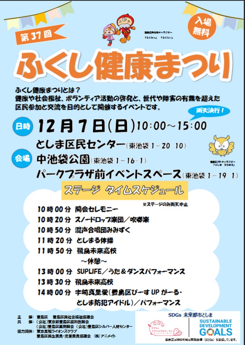 豊島区の「第37回ふくし健康まつり」は12月7日に「中池袋公園」と「としま区民センター」などで10時から15時に開催される。このイベントは、健康や社会福祉、ボランティア活動の啓発と、世代や障害の有無を超えた区民参加と交流を目指して開催される。【中池袋公園】では、ステージと自主製品の販売・模擬店、バザー、活動紹介がある。 自主製品の販売は、共同作業所オーク、麦の家、あとりえゆうかり、いけぶくろ茜の里 、ハートランドみのり、このはの家 、駒込生活実習所・福祉作業所、豊島区シルバー人材センター、サンハウス、フレンド&ル・ピュル、メジロック(目白生活実習所・福祉作業所)、東京福祉大学が出店予定。そして豊島区更生保護女性会によるバザーもある。 中池袋公園のステージは、10時からオープニング、そして、パフォーマンスは、スノードロップ楽団、混声合唱団みみずく、飛鳥未来高校、SUPLIFE、宇崎真里愛さんのステージ。 【パークプラザ前】では、肺年齢測定「あなたの肺は何歳ですか?〜COPD について知りましょう〜」、すずらんスマイルプロジェクトの紹介 、女の子のからだのお悩み相談カフェ(豊島区助産師会)など。 福祉関連《グループ・団体の紹介コーナー》は、小児がんの子ども支援の「ゴールドリボン・ネットワーク」や「Yell for ALL」、「豊島区児童相談所フォスタリング機関二葉乳児院」、「すずらんスマイルプロジェクト」の活動紹介もある。 豊島区助産師会による<女の子のからだのお悩み相談コーナー>、福祉車両の展示・車いすの体験もできる。 【区民センター】会場では、4階から8階まで各階で福祉と健康に関する多様な活動の紹介。例えば、8階の健康展では骨密度や脳年齢などの健康測定体験、薬なんでも相談。7階は豊島区歯科技工士会の活動紹介、鍼灸師による「ツボ」のレクチャー、補助犬の活動紹介、手話教室、スマホ教室など・・。 ■第37回ふくし健康まつり https://www.city.toshima.lg.jp/171/event/2408190908.html ■障害者週間 https://www.metro.tokyo.lg.jp/information/press/2025/11/2025111001 |