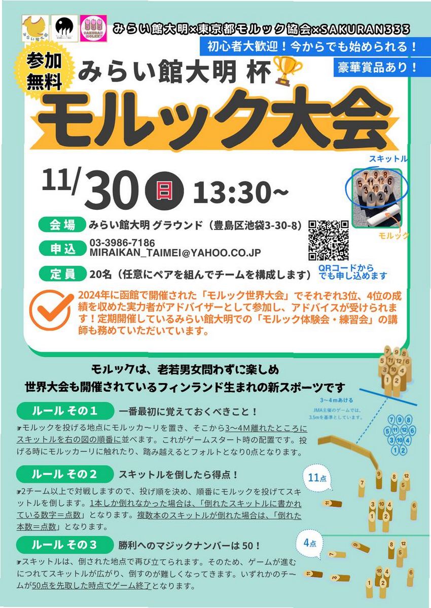 池袋3丁目の「みらい館大明」は、11月30日(13:30~16:00)にモルックの<第4回みらい館大明杯>を開催する。いま参加者(定員20名)を募集中。「モルックって何?」という方も、老若男女問わず初めての人でも楽しめるスポーツ。ルールは、1から12までの数字が書かれた木製のピン(スキットル)を、木の棒(モルック)を投げて倒し、先に50点ちょうどに到達したチーム(2~4人)が勝利となるスポーツ。 大会では、過去に「モルック世界大会」で好成績を収めたアドバイザーも参加し、アドバイスが受けられるチャンスも。 会場はみらい館大明グラウンド 参加費は無料 詳細は下記 みらい館大明(facebook)で ■みらい館大明 facebook https://www.facebook.com/miraikantaimei/?locale=ja_JP ■みらい館大明 http://www.toshima.ne.jp/taimei/ ■日本モルック協会 https://molkky.jp/ ■東京モルック協会 https://x.com/molkkytokyo |