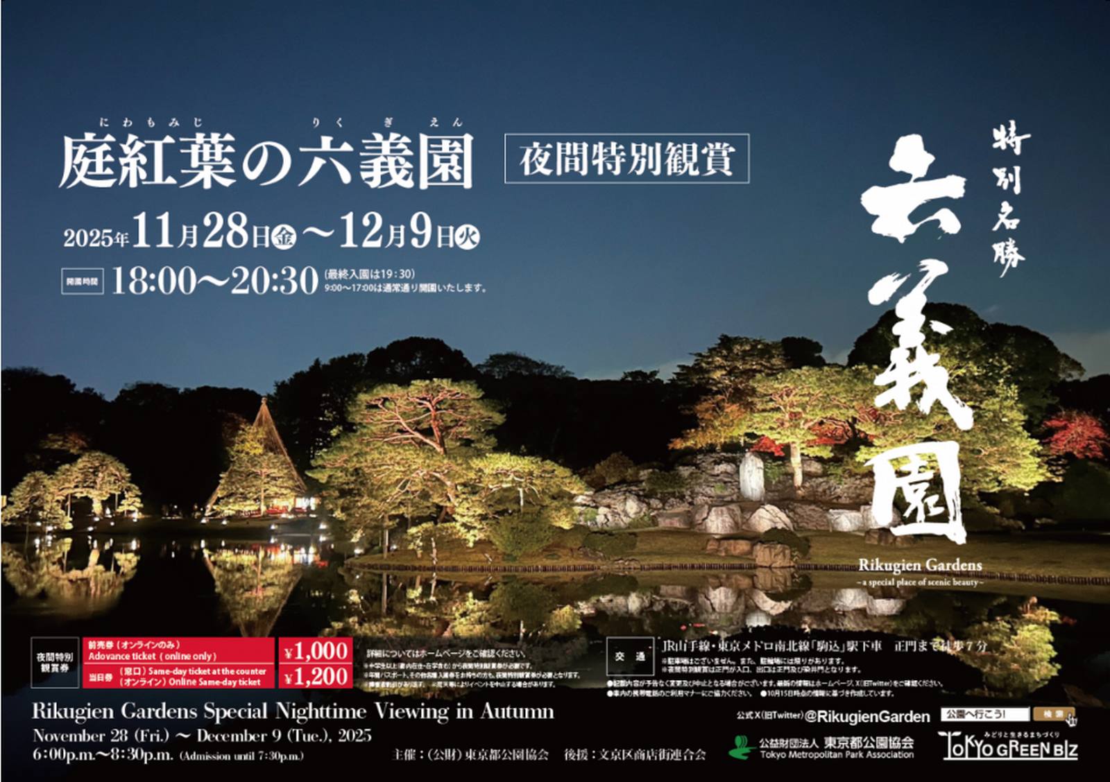 JR駒込駅近くの六義園が紅葉の季節に合わせて、夜間特別鑑賞イベント「庭紅葉の六義園」を11月28日から12月9日(18:00-20:30)まで開催する。ライトアップは、園内の紅葉エリアを中心に園内各所で行われ、昼間とは違った夜の庭園を鑑賞できる。園内にライトアップされた複数の記念撮影スポットも設置される。 また、岩崎家所有時代に建てられた土蔵の壁面に「土蔵ジェクション」と題して<歴史ある土蔵の美しい形状に合わせ、きらびやかな和の世界を投影します。土蔵の特徴的な形に合わせ変化していく映像>を上映する。 この期間中、園内の「吹上茶屋・心泉亭」で抹茶と和菓子のセット、六義園オリジナルお土産などを販売する。土蔵横の広場、吟花亭跡付近でも「六義園屋台」として、お団子などの軽飲食の販売、文京区商店街連合会加盟店のキッチンカーも出店する。 チケットは下記<紅葉ライトアップサイト>でオンライン販売、料金1,000円 小学生以下は無料。当日券は庭園窓口でも1,200円(現金のみ)小学生以下無料。ただし前売券・当日券とも枚数制限あり。 ▽六義園は六義園は造園当時から小石川後楽園とともに江戸の二大庭園に数えられている。元禄8年(1695年)、五代将軍・徳川綱吉より下屋敷として与えられた駒込の地に、柳澤吉保自ら設計、指揮し、平坦な武蔵野の一隅に池を掘り、山を築き、7年の歳月をかけて「回遊式築山泉水庭園」を造り上げた。 ■六義園 https://www.tokyo-park.or.jp/park/rikugien/index.html ■六義園 紅葉ライトアップ https://www.tokyo-park.or.jp/special/rikugien_lighting/index.html |