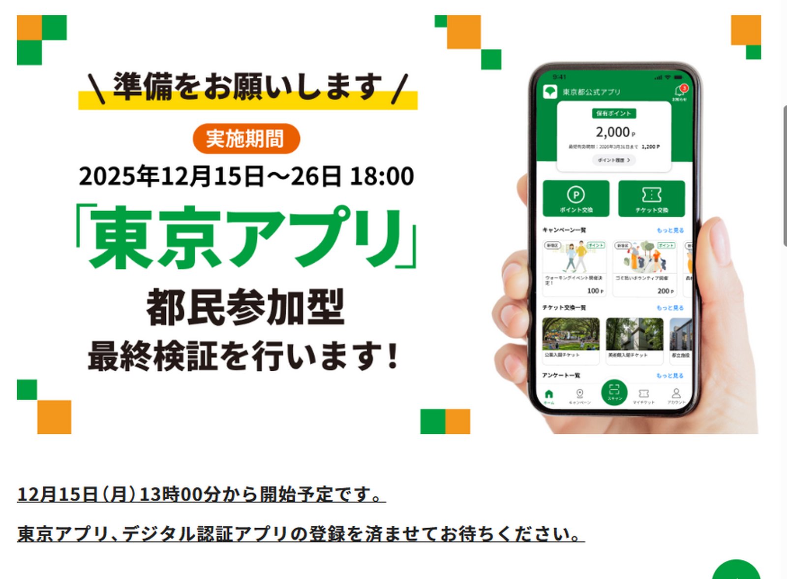 東京アプリで 1万1千ポイント付与 都民参加の最終検証を12/15~12/26に実施 東京公式アプリ |